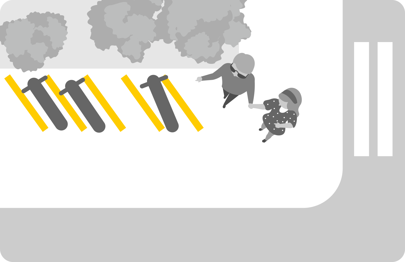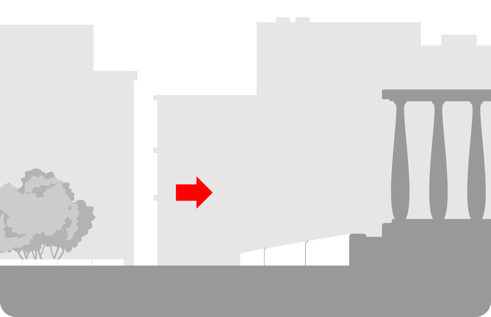 Você está na calçada. À direita está a parede de um prédio. Onde é o melhor lugar para deixar a patinete?